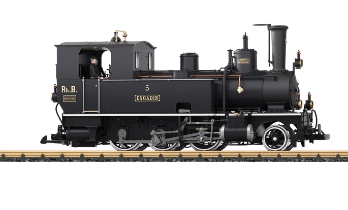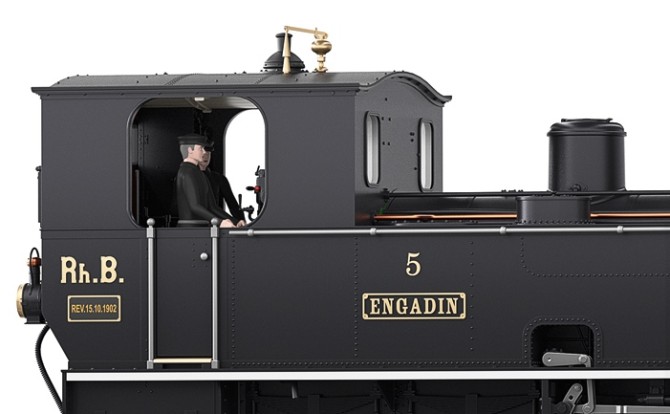 Modell der Lok 5 "Engadin" der Rhätischen Bahn. Die letzte Lok aus der ersten Lieferserie im Zustand nach der Umbenennung der Landquart-Davos-Bahn in Rhätische Bahn im Jahr 1895. Das Modell weist vorbildgerechte Unterschiede zur Rhätia auf. So sind beispielsweise Leitungen anders geführt und die Fenster an der Führerhausrückseite unterschiedlich.